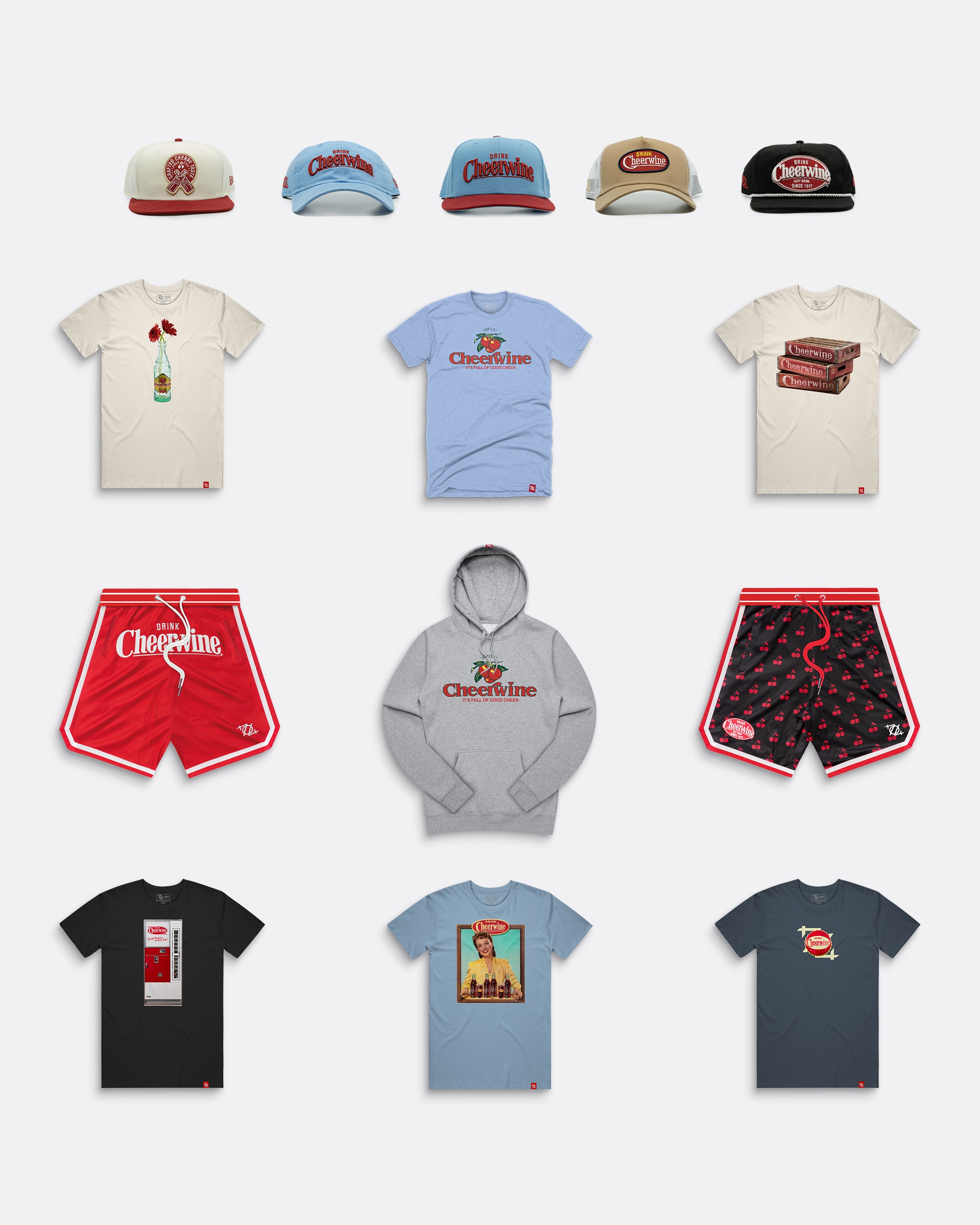 We teamed up with Cheerwine, a local soft drink company with a cult-like following in the Carolinas to develop a capsule collection that blends the lines between culture, streetwear, and product. We developed a few cut-and-sew pieces, worked with our friends at New Era to design and produce high-quality headwear, and designed an array of t-shirts and hoodies.